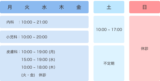 土曜日の診療は午前10:00-13:00、午後は15:00-17:00まで